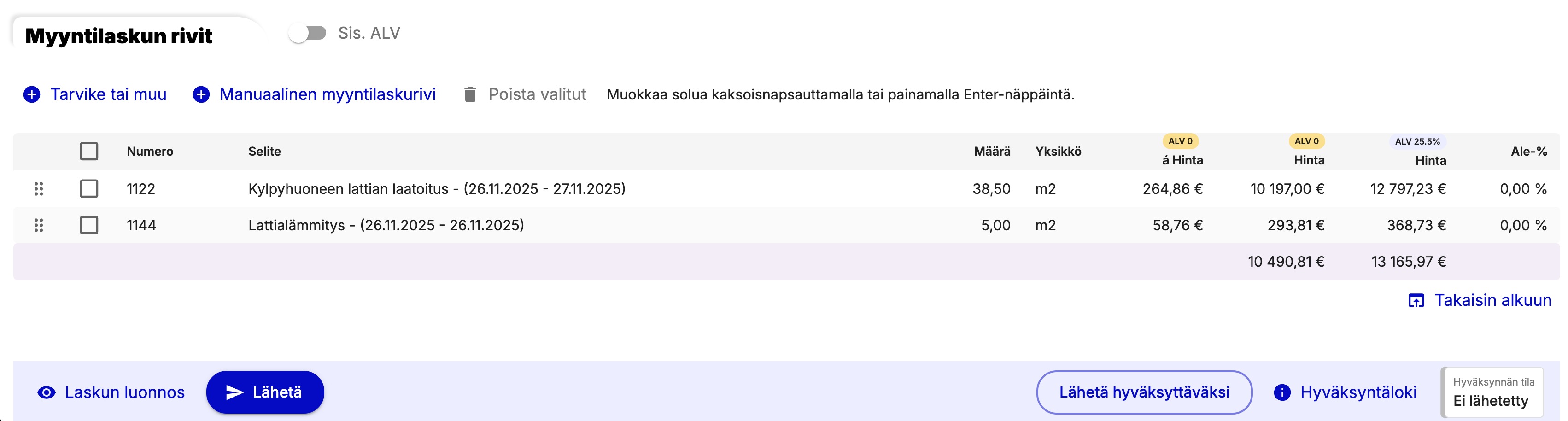 - Tämä selkeyttää ja lyhentää myyntilaskua, kun yhdestä yksikköhintarivistä muodostuu vain yksi myyntilaskurivi ja tarkempi kirjauskohtainen erittely löytyy myyntilaskun liitteeltä.
