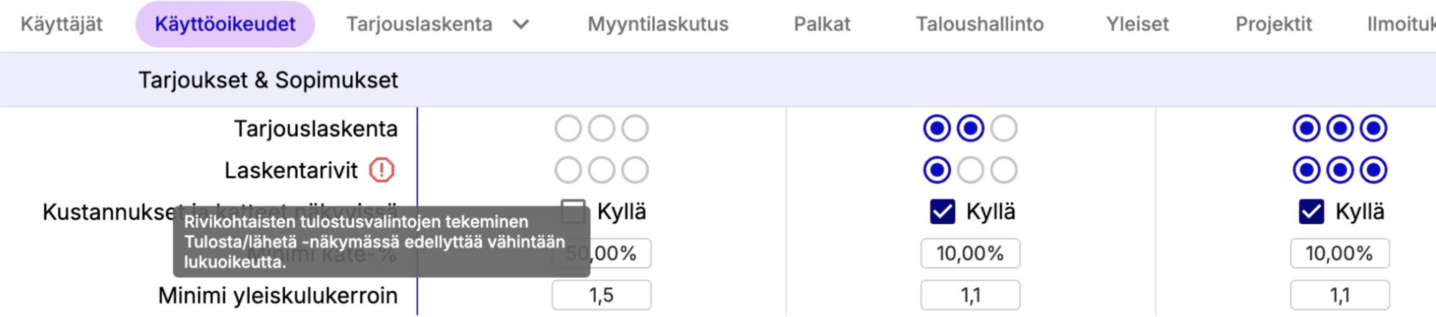 - Käyttöoikeus vaikuttaa yksittäisten tarjouslaskentojen laskentanäkymään, tarjousten ja sopimusten tulosteisiin, tulostusvalintoihin, esikatseluihin ja sähköpostitse Fondionista lähetettäviin tarjous- ja sopimusdokumentteihin.