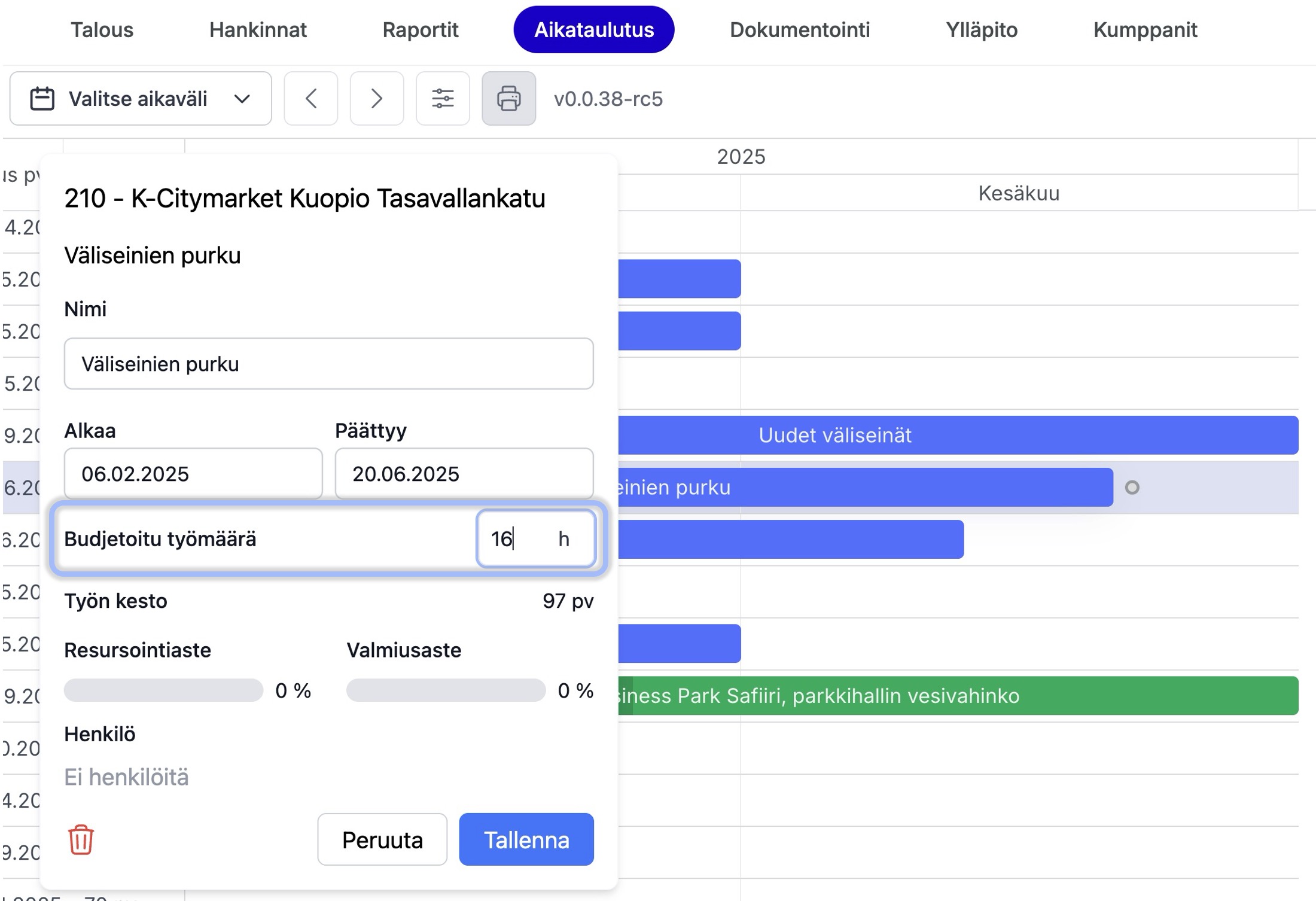 - Voit nyt asettaa haluamasi budjetoidut tunnit aikataulutuksen yksittäisille tehtäville.